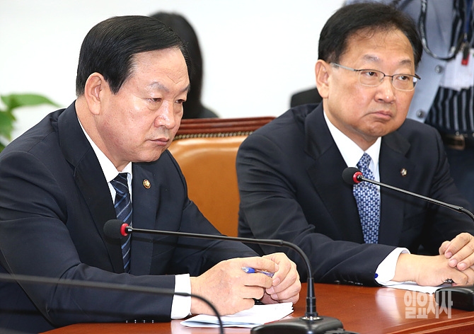 '세월호 참사'로 사회 전체적으로 분위기가 침체되어 있는 가운데 21일 오전, 서울 여의도 국회에서 열린 새누리당 최고위원회의 도중 '4성 장군' 출신의 한기호 최고위원(사진 왼쪽)이 무거운 표정을 하고 있다.