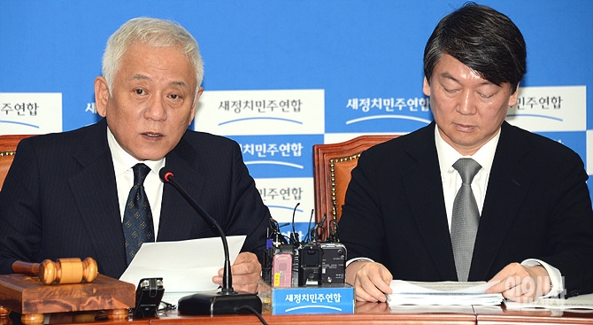 김한길(사진 왼쪽)-안철수 새정치민주연합 공동대표가 21일 오전, 서울 여의도 국회에서 열린 새정치민주연합 최고위원 및 여객선침몰사고 대책위원장단 연석회의를 주재하고 있다.
