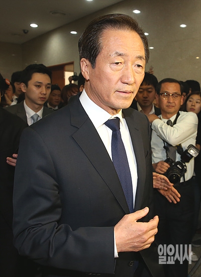 새누리당 정몽준 서울시장 후보가 21일, 서울 여의도 국회 정론관에서 전날 막내아들의 발언 관련 기자회견 직후 퇴장하고 있다.