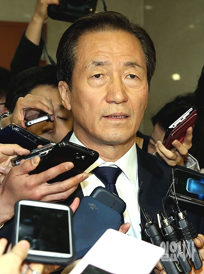 21일, 정몽준 새누리당 서울시장 후보가 최근 자신의 막내 아들의 '세월호 침몰' 관련 발언과 관련해 서울 여의도 국회 정론관 기자회견 직후 취재진의 질문에 답변하고 있다.