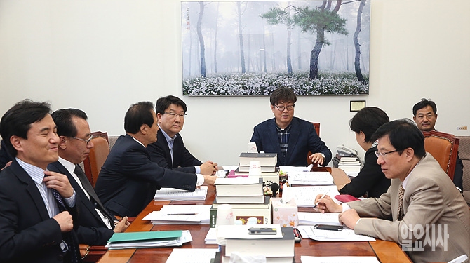 이춘석 법사위 소위원장(사진 가운데) 등 위원들이 22일 오전, 서울 여의도 국회 법제사법위원회 법안심사 제2소위에서 공직선거법 등 법안을 심의하고 있다.