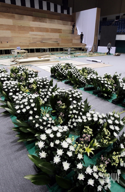 여객선 '세월호' 침몰 7일째를 맞고 있는 22일 사고로 희생된 안산 단원고등학교 학생들을 위한 임시 합동분향소가 경기도 안산 올림픽기념관에 마련되고 있다.