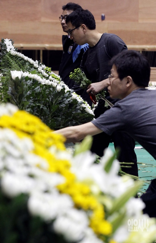 여객선 '세월호' 침몰 7일째를 맞고 있는 22일 사고로 희생된 안산 단원고등학교 학생들을 위한 임시 합동분향소가 경기도 안산 올림픽기념관에 마련되고 있다.