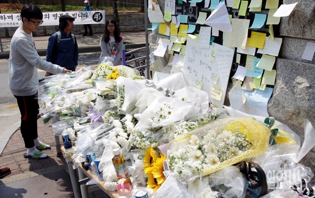 여객선 '세월호' 침몰 7일째를 맞고 있는 22일 안산 단원고등학교 정문에 희생자를 추모하고 실종자의 무사귀환을 기원하는 메시지가 담긴 쪽지와 꽃이 놓여 있다.