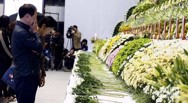 여객선 '세월호' 침몰 8일째를 맞고 있는 23일 경기도 안산 올림픽기념관에 마련된 임시 합동분향소에서 추모객들이 영정사진을 바라보며 슬픔에 잠겨있다.