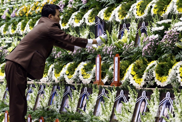여객선 '세월호' 침몰 8일째를 맞고 있는 23일 경기도 안산 올림픽기념관에 마련된 임시 합동분향소에서 관계자들이 영정사진과 위패를 안치하고 있다.