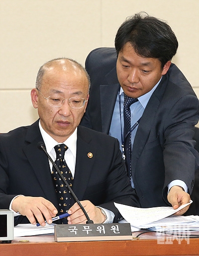 23일 오후, 문형표 보건복지부 장관이 서울 여의도 국회에서 열린 보건복지부 전체회의 도중 관계자로부터 답변자료를 건네받고 있다.