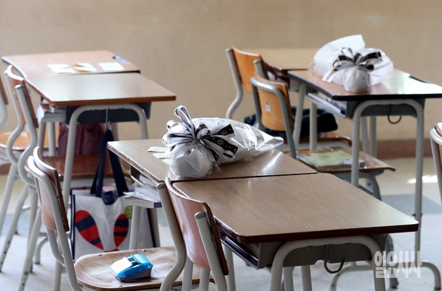 여객선 '세월호' 침몰 8일째를 맞고 있는 23일 경기도 안산 단원고 2학년 교실 책상에 희생자들의 영면을 기원하는 국화꽃이 놓여 있다.