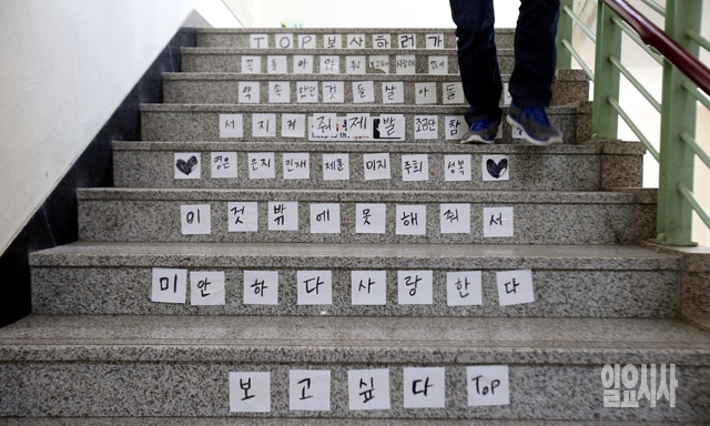 여객선 '세월호' 침몰 8일째를 맞고 있는 23일 경기도 안산 단원고 계단에 실종자들의 무사귀환을 기원하는 메모지가 붙여 있다.