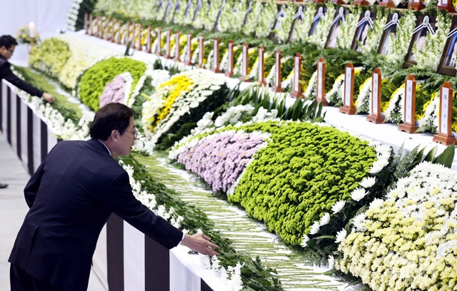김황식 새누리당 서울시장 예비후보가 24일 경기도 안산 올림픽체육관에 마련된 합동분향소를 찾아 헌화하고 있다.