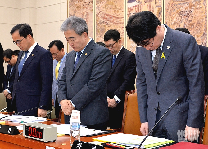 24일 오후, 유진룡 문화체육관광부 장관, 나승일 교육부 차관 등 참석자들이 서울 여의도 국회에서 열린 교육문화체육관광위원회 전체회의 직전, 세월호 참사 희생자와 유족들에게 묵념하고 있다.