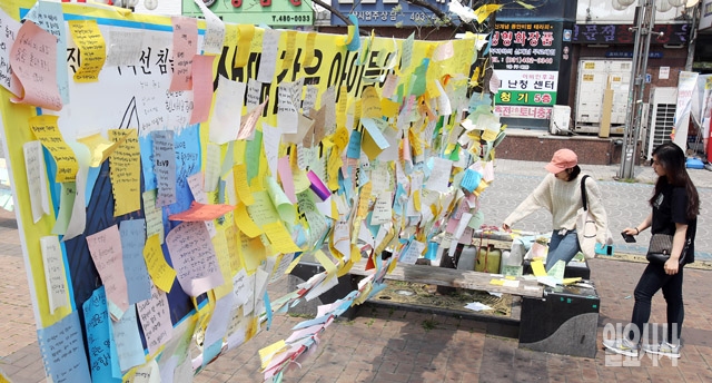 여객선 '세월호' 침몰 9일째를 맞고 있는 24일 안산 단원구 중앙역 앞 거리에 실종자의 무사귀환을 기원하는 희망 메시지가 붙여 있다.