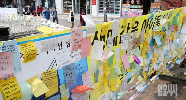 여객선 '세월호' 침몰 9일째를 맞고 있는 24일 안산 단원구 중앙역 앞 거리에 실종자의 무사귀환을 기원하는 희망 메시지가 붙여 있다.