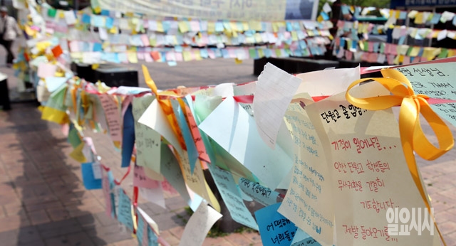 여객선 '세월호' 침몰 9일째를 맞고 있는 24일 안산 단원구 중앙역 앞 거리에 실종자의 무사귀환을 기원하는 희망 메시지가 붙여 있다.