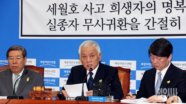 김한길 새정치민주연합 공동대표가 25일 서울 여의도 국회에서 열린 최고위원 및 여객선 침몰사고 대책위원장단 연석회의에서 모두발언을 하고 있다.