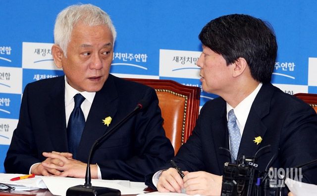 김한길(왼쪽), 안철수 새정치민주연합 공동대표가 25일 서울 여의도 국회에서 열린 최고위원 및 여객선 침몰사고 대책위원장단 연석회의에서 이야기를 나누고 있다.