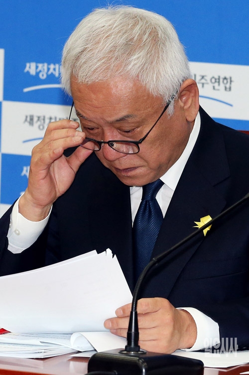 김한길 새정치민주연합 공동대표가 25일 서울 여의도 국회에서 열린 최고위원 및 여객선 침몰사고 대책위원장단 연석회의에서 안경을 쓰고 있다.