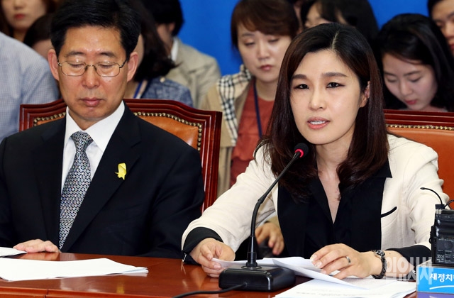 천근아 연세대 세브란스병원 소아정신과 전문의(오른쪽)가 25일 서울 여의도 국회에서 열린 최고위원 및 여객선 침몰사고 대책위원장단 연석회의에서 발언을 하고 있다.