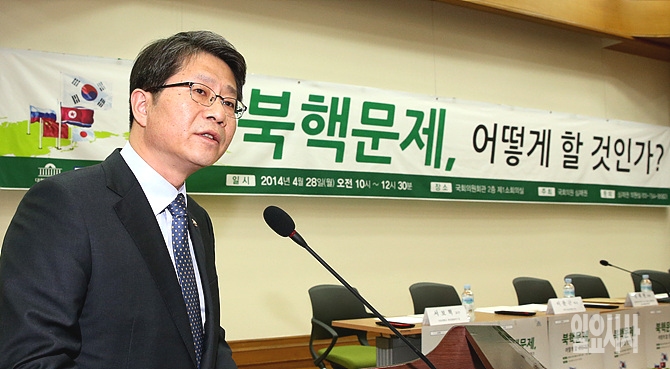28일 오전, 서울 여의도 국회에서 새정치민주연합 심재권 의원 주최로 열린 '북핵문제, 어떻게 할 것인가' 토론회 직전 류길재 통일부 장관이 축사하고 있다.