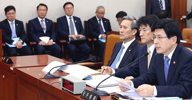 28일 오후, 서울 여의도 국회에서 열린 법제사법위원회 전체회의 도중 황교안 법무부장관이 의원들의 질의에 답변하고 있다.