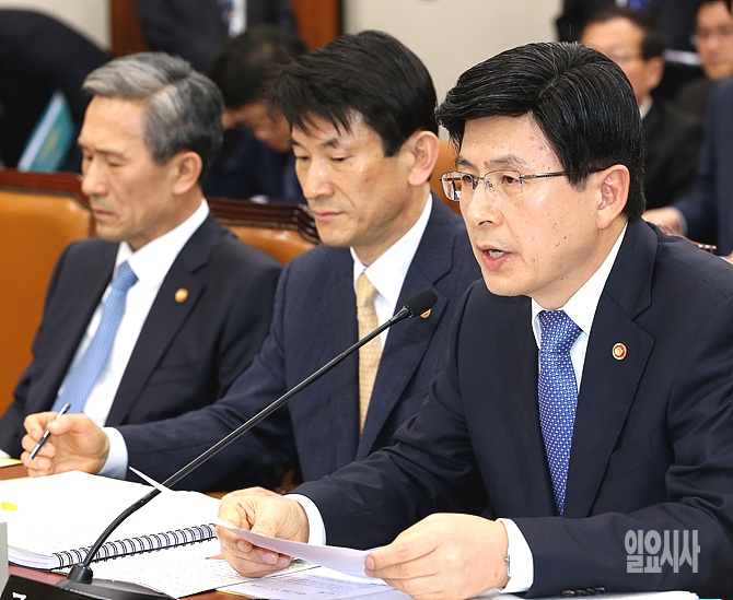 28일 오후, 서울 여의도 국회에서 열린 법제사법위원회 전체회의 도중 황교안 법무부장관이 의원들의 질의에 답변하고 있다.