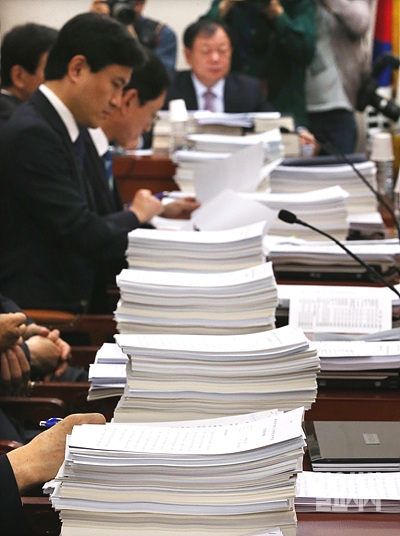 28일 오후, 서울 여의도 국회에서 법제사법위원회 전체회의가 열린 가운데, 한 의원의 책상에 질문 자료들이 쌓여져 있다.