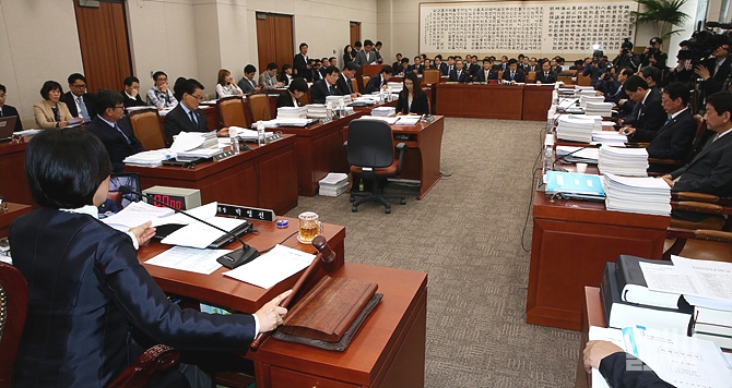 28일 오후, 서울 여의도 국회에서 법제사법위원회 전체회의가 열린 가운데, 박영선 법사위원장이 개회 시작을 알리는 의사봉을 두드리고 있다.