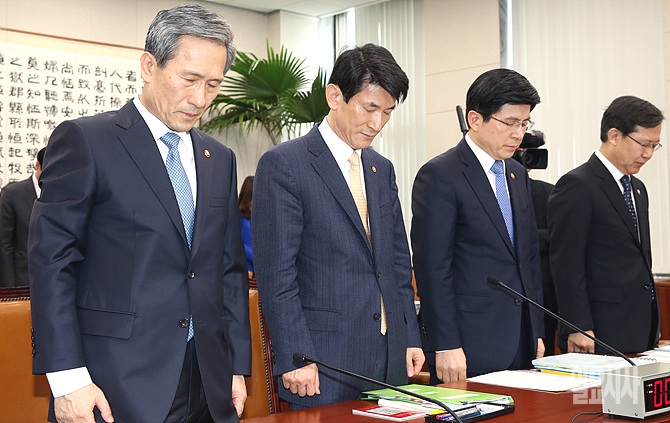 28일 오후, 서울 여의도 국회에서 열린 법제사법위원회 전체회의 직전, 김관진 국방부장관 등이 '세월호 희생자'들에 대해 잠시 묵념하고 있다.