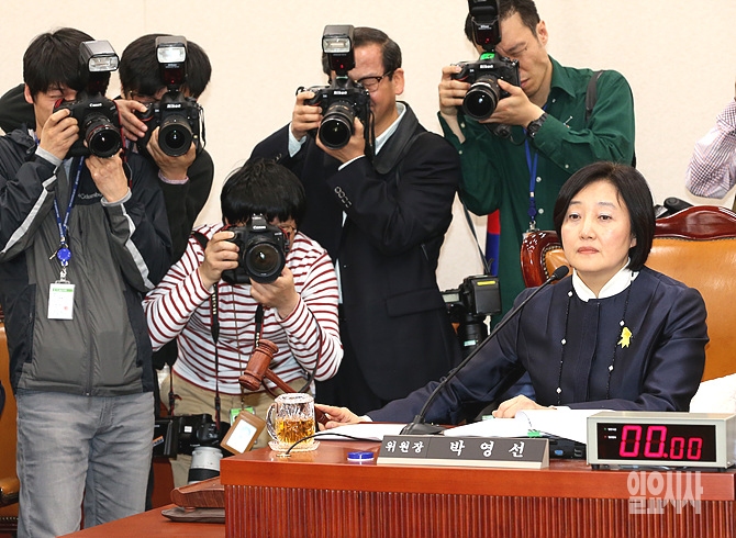 28일 오후, 서울 여의도 국회에서 법제사법위원회 전체회의가 열린 가운데, 박영선 법사위원장이 개의를 알리는 의사봉을 두드리고 있다.