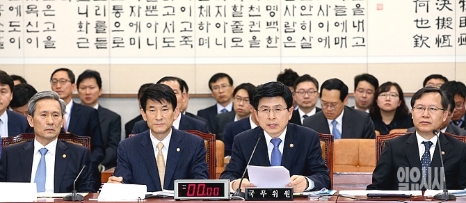 28일 오후, 서울 여의도 국회에서 법제사법위원회 전체회의가 열린 가운데, 황교안 법무부장관(사진 오른쪽에서 두 번째)이 의원들의 질의에 답변하고 있다.