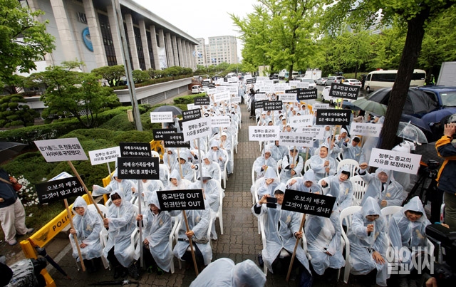 기독교복음침례회(일명 구원파) 신도들이 28일 서울 여의도 KBS 본관 앞에서 '정부·언론 공정성 촉구 집회'를 갖고 있다.