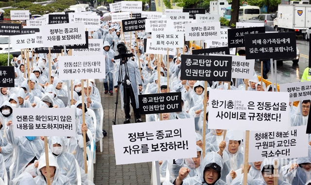 기독교복음침례회(일명 구원파) 신도들이 28일 서울 여의도 KBS 본관 앞에서 정부·언론 공정성 촉구 집회를 갖고 있다.