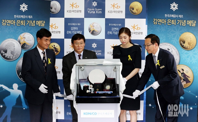 피겨스케이팅 김연아 선수가 28일 서울 마포구 한국조폐공사에서 은퇴 기념 메달을 공개하고 있다. 사진 왼쪽부터 조폐공사 이흥균 이사, 백상현 단장, 김연아, 풍산화동양행 이제철 사장.