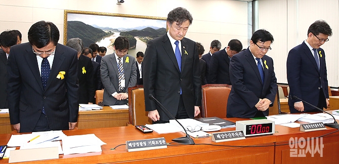 국회 농림축산식품해양수산위원회 전체회의가 28일 오후, 서울 여의도 국회에서 열린 가운데, 참석자들이 회의 직전 세월호 참사 희생자들을 기리며 잠시 묵념하고 있다.