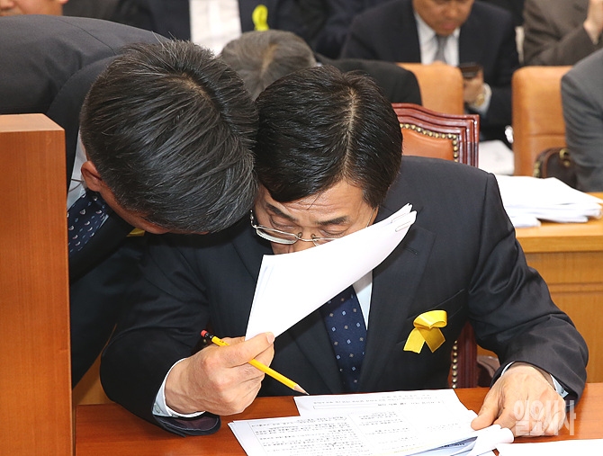 28일 오후, 서울 여의도 국회에서 농림축산식품해양수산위원회 전체회의가 열린 가운데, 김광준 해양경찰청 기획조정관이 관계자로부터 보고받고 있다.
