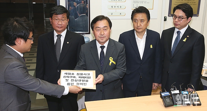 28일, 서울 여의도 국회 의안과에 새정치민주연합 김영환·전해철 의원 등이 '세월호 침몰사고 신속구조, 피해지원 및 진상규명을 위한 결의안'을 제출하고 있다.