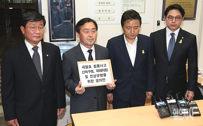 28일, 서울 여의도 국회 의안과에 새정치민주연합 김영환·전해철 의원 등이 '세월호 침몰사고 신속구조, 피해지원 및 진상규명을 위한 결의안'을 제출하고 있다.
