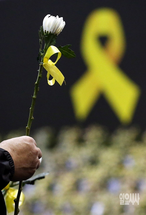 29일 경기 안산 화랑유원지에 마련된 세월호 사고 희생자 정부 합동분향소를 찾은 한 추모객이 국화꽃을 들고 있다.