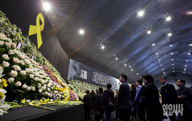 29일 경기 안산 화랑유원지에 마련된 세월호 사고 희생자 정부 합동분향소를 찾은 추모객들이 조문을 하고 있다.