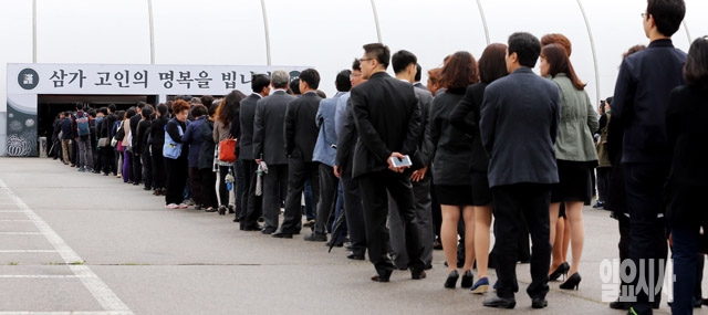 29일 경기 안산 화랑유원지에 마련된 세월호 사고 희생자 정부 합동분향소를 찾은 추모객들이 조문을 하기 위해 줄지어 서 있다.
