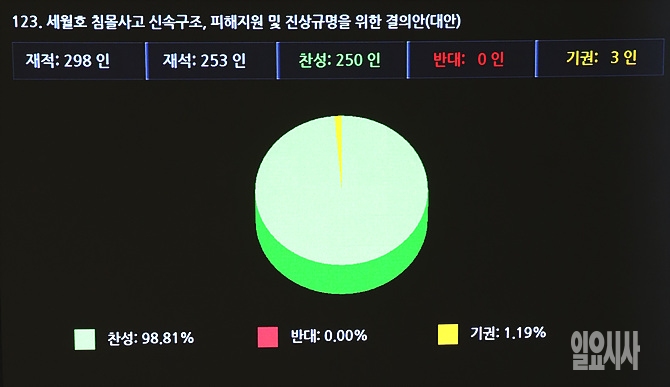 29일 오후, 서울 여의도 국회 본회의장에서 열린 '세월호 침몰사고 신속 구조 및 진상규명을 위한 결의안'에 대한 표결이 전광판에 표시되고 있는 가운데, 기권표가 3석이나 나와 어느 의원이 기권표를 던졌는지 이목이 쏠리고 있다.