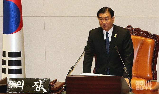 29일 오후, 서울 여의도 국회 본회의장에서 열린 '세월호 침몰사고 신속 구조 및 진상규명을 위한 결의안'에 대한 표결이 진행되고 있는 가운데, 희생자들을 추모하는 노란리본이 강창희 국회의장의 상의에 달려져 있다.