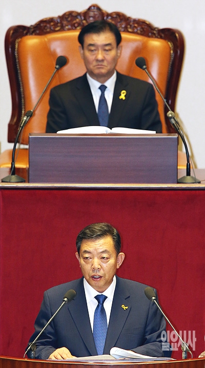29일 오후, 서울 여의도 국회 본회의장에서 열린 '세월호 침몰사고 신속 구조 및 진상규명을 위한 결의안'에 대한 표결에 앞서, 새정치민주연합 이찬열 의원이 제안설명을 하고 있다.