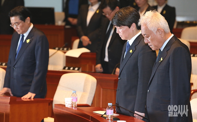 29일 오후, 서울 여의도 국회에서 열린 새정치민주연합 의원총회 직전, 김한길-안철수 공동대표 및 의원들이 '세월호 침몰사고'와 관련해 잠시 묵념하고 있다.