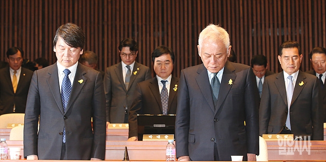 29일 오후, 서울 여의도 국회에서 열린 새정치민주연합 의원총회 직전, 김한길·안철수 공동대표 및 의원들이 '세월호 침몰사고'와 관련해 묵념하고 있다.