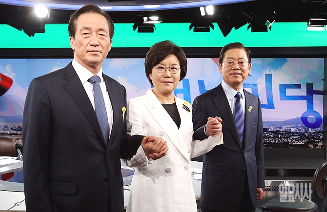정몽준(사진 왼쪽)·김황식(사진 오른쪽)·이혜훈 새누리당 서울시장 예비후보들이 29일 오후, 서울 중구 매경미디어센터 MBN스튜디오에서 경선 후보 2차 토론회 시작 전, 기념촬영을 하고 있다.