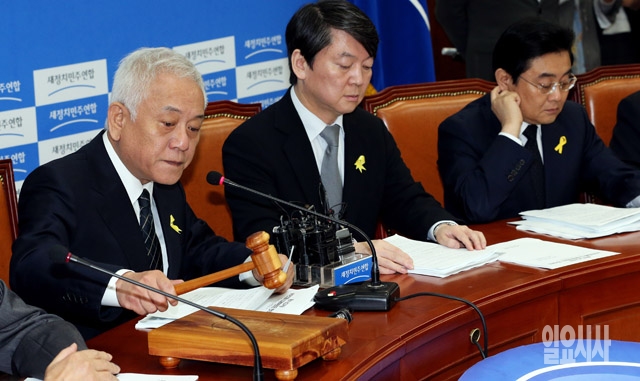 김한길 새정치민주연합 공동대표가 30일 서울 여의도 국회에서 열린 최고위원 및 여객선침몰사고 대책위원장단 연석회의에서 회의 시작을 알리는 의사봉을 두드리고 있다.