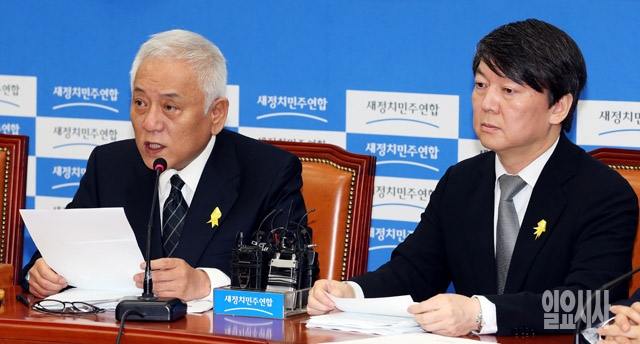 김한길 새정치민주연합 공동대표(왼쪽)가 30일 서울 여의도 국회에서 열린 최고위원 및 여객선침몰사고 대책위원장단 연석회의에서 모두발언을 하고 있다.
