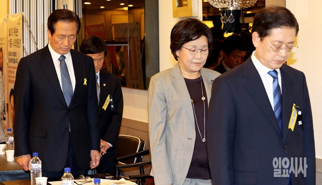 30일 서울 종로구 성균관대학교 유림회관에서 열린 '6ㆍ4 지방선거 새누리당 종로구 시의원 후보 선출대회'에서 정몽준(왼쪽부터), 이혜훈, 김황식 서울시장 경선후보들이 세월호 참사 희생자에 대한 묵념을 하고 있다.