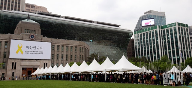 30일 세월호 희생자 합동분향소가 설치된 서울시청 앞 광장에 추모객들이 조문을 하기 위해 줄지어 서 있다.